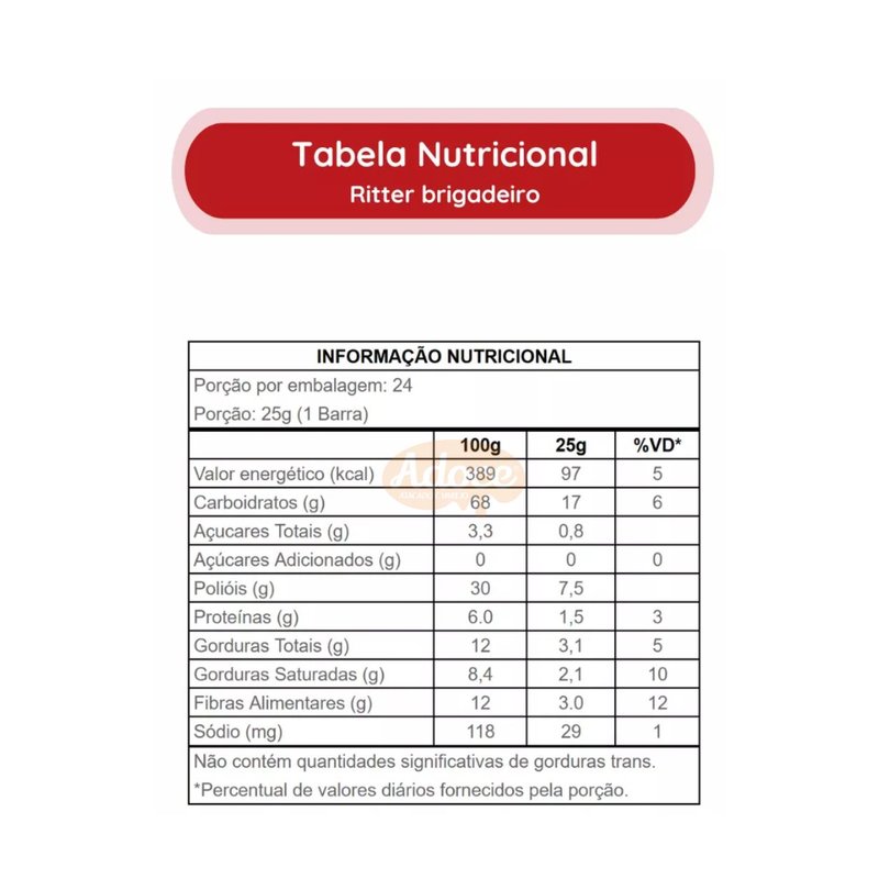 Ingredientes: Cereais (aveia e flocos de arroz), Cobertura sabor chocolate zero adição de açúcares, Gordura vegetal, Cacau em pó, Pecãs, Edulcorantes sorbitol e sucralose, Estabilizante goma acácia, Umectante glicerol, Aromatizante e antioxidantes lecitina de soja e mistura concentrada de tocoferóis.