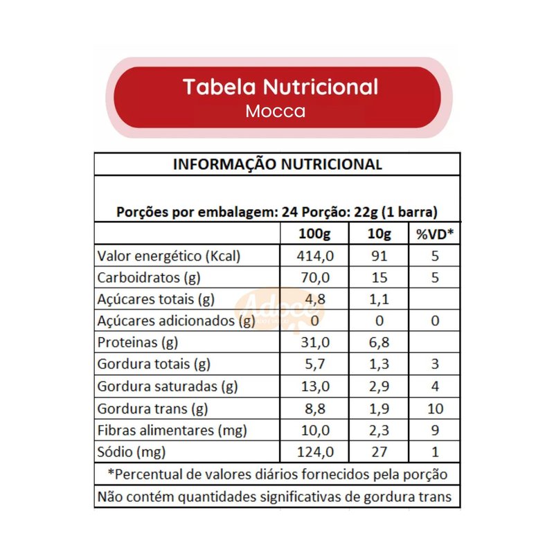 Ingredientes: Cereais (aveia e flocos de arroz), Cobertura sabor chocolate zero adição de açúcares, Gordura vegetal, Cacau em pó, Pecãs, Edulcorantes sorbitol e sucralose, Estabilizante goma acácia, Umectante glicerol, Aromatizante e antioxidantes lecitina de soja e mistura concentrada de tocoferóis.