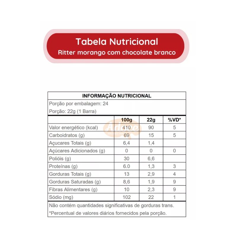 Ingredientes: Cereais (aveia e flocos de arroz), Cobertura sabor chocolate branco zero adição de açúcares, Gordura vegetal, Polpa de morango, Polpa de maçã, Soro de leite, Edulcorantes sorbitol e sucralose, Estabilizantes goma acácia e ésteres de ácidos graxos com poliglicerol, Umectante glicerol, Aroma, Corante natural carmim e Antioxidante mistura concentrada de tocoferóis.